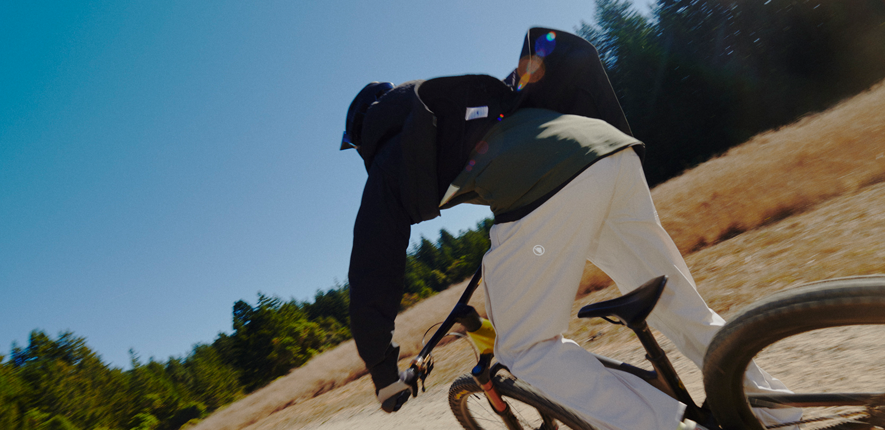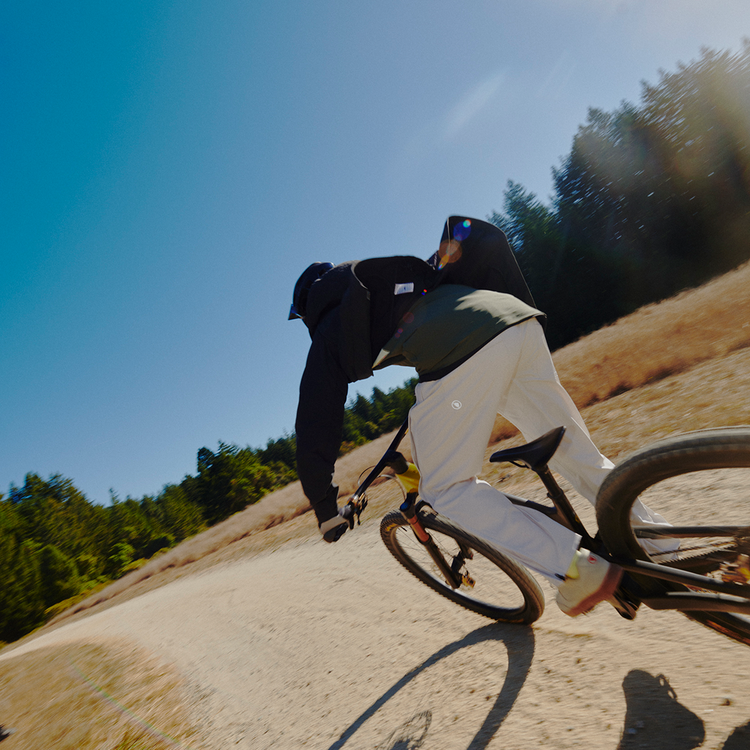 Two people on bicycles interacting under a bridge with a cityscape in the background Two people on bicycles interacting under a bridge with a cityscape in the background